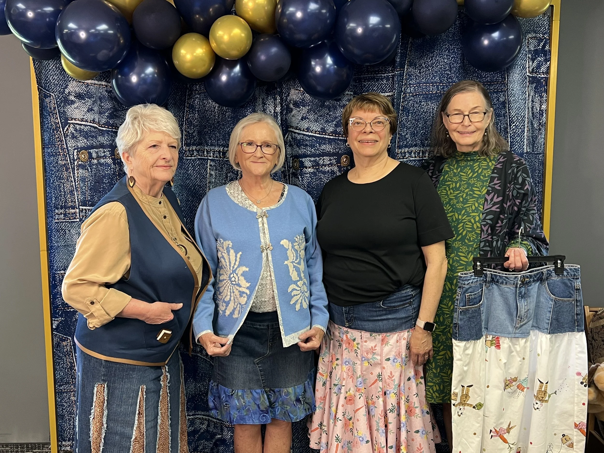 It was a beautiful day at Nowthen Alliance Church for our Dressed-Up Denim Fashion Show. If you did not attend, you missed a wonderful venue and great food. (Some of the best food ever at any of our Fashion Shows!) We had wonderful creations showcased by our members and Junior members. Our annual Presidents Challenge was “Sophisticated Effortlessness” with Kay Bererson winning with her Upcycled Denim tablecloth made into a dress. A wonderful sewing machine cake was made and donated by one of are members and it was won by Kay Bererson. Kay also won one of the door prizes. (I think she must have rigged this, just kidding)